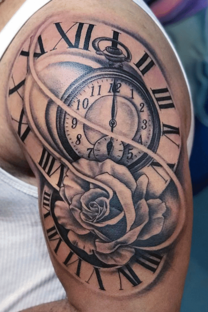 When time meets beauty, you get the clock-and-rose combo — one of the most popular and meaningful tattoo pairings. It represents love, loss, and the fleeting nature of life. The rose softens the hard lines of the clock, creating perfect balance. This design fits beautifully on the forearm, flowing naturally from wrist to elbow. The shading and details give it a cinematic look. Every glance reminds you that time is precious, and beauty can exist even in impermanence.