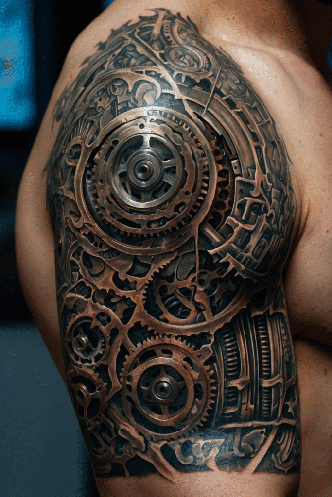 Turn your arm into a machine of power and precision. The biomechanical tattoo fuses skin and steel in mind-blowing detail — gears, pistons, and wires woven under torn flesh effects. It’s futuristic, gritty, and visually insane. Perfect for the upper arm or a full sleeve, it shows off artistry and strength in one design. This tattoo screams innovation, transformation, and raw masculine energy. It’s like saying, “I’m built different” — and meaning it.