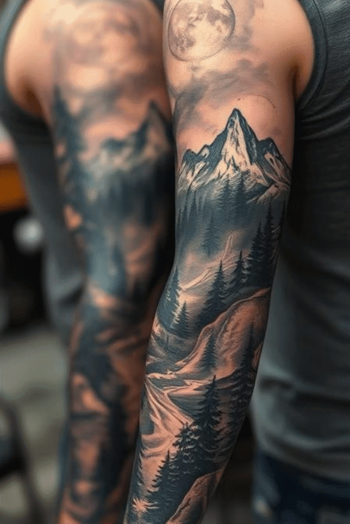 Nature lovers, this one’s for you. The forest sleeve tattoo creates an epic, cinematic feel — rows of pine trees fading into mist, mountains in the distance, maybe a lone wolf or stag in the shadows. It looks incredible in black and grey with smooth gradients and depth. The forest symbolizes growth, solitude, and grounding energy. Every tree stands tall — just like you through life’s storms. It’s peaceful, mysterious, and bold — a masterpiece for the modern man.