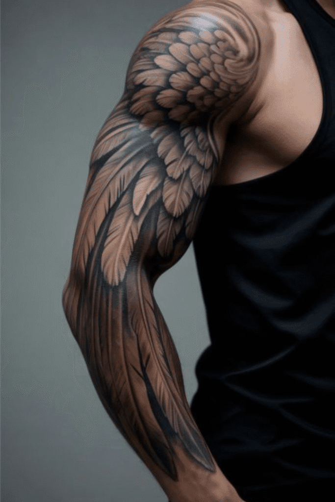 Nothing says freedom and protection like a pair of angel wings stretching across your arm. Whether you ink a single wing down the forearm or both spreading from shoulder to elbow, it gives your body a celestial edge. The design symbolizes purity, faith, and strength through struggle. With fine shading and feather detailing, it looks incredibly lifelike. It’s a tattoo that reminds you to rise every time you fall — a guardian on your skin guiding you forward.