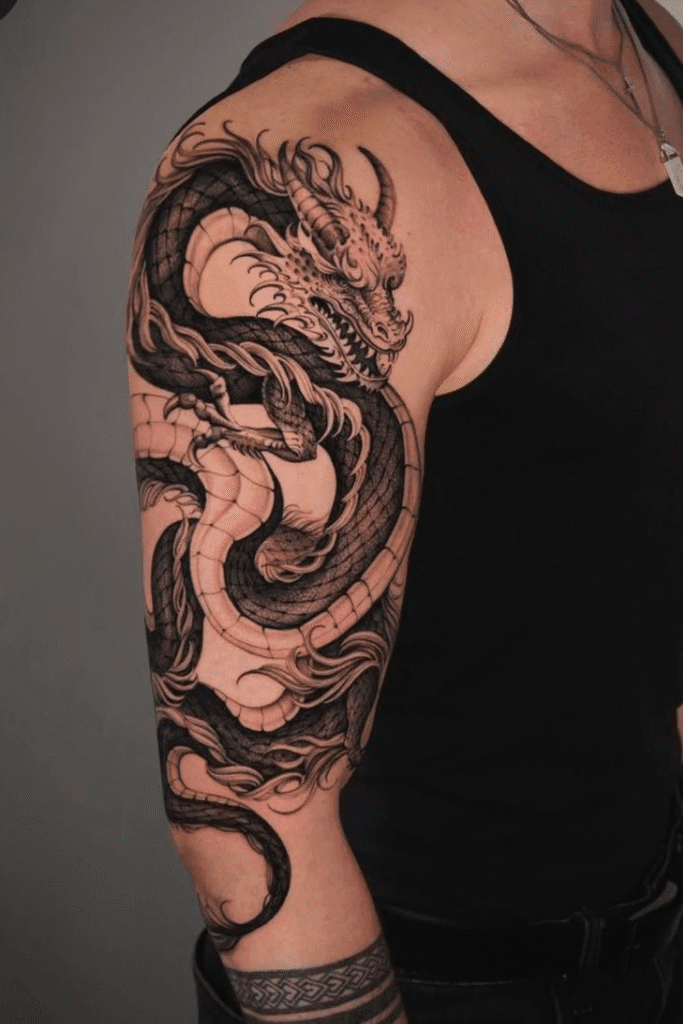 Power, mystery, and raw energy — the dragon tattoo brings ancient legends to life. Curling up your arm or breathing fire from shoulder to wrist, it symbolizes wisdom, strength, and protection. Go for an Asian-style dragon for fluid, flowing motion, or a Western dragon for a fierce, armored look. Either way, it dominates attention. Every curve of the dragon accentuates your arm muscles, turning your ink into a statement of unstoppable fire and masculine power.