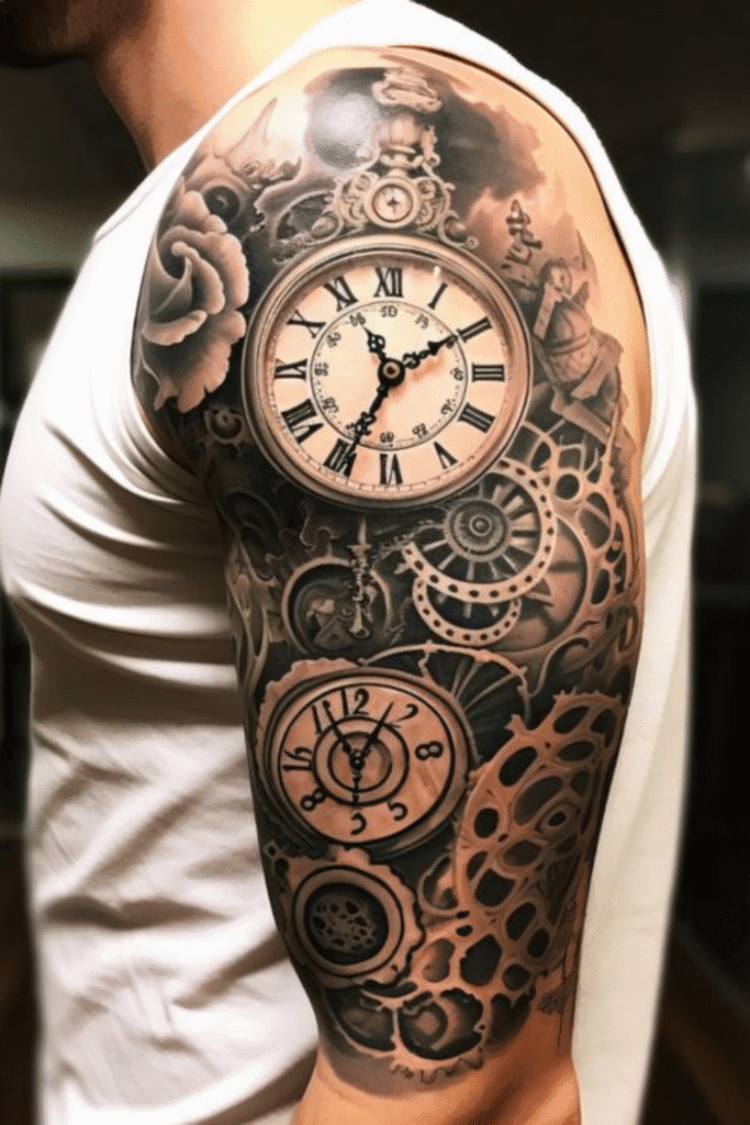 Time never stops — and that’s exactly what makes a clock tattoo timeless. Whether you go for a broken watch face, Roman numerals, or gears showing the inner mechanics, it’s a perfect metaphor for valuing moments. Place it on the inner forearm or mix it into a sleeve design with roses or eyes. The message? You know the value of time — and you’re not wasting a second. It’s classy, symbolic, and gives your arm serious visual weight.