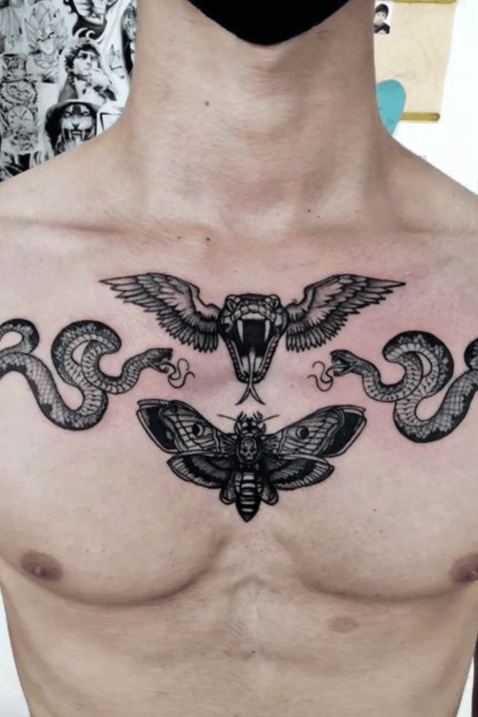 Serpents symbolize transformation, wisdom, and rebirth. A snake tattoo that coils across the chest creates movement and intensity. Picture the serpent’s head resting near the shoulder or sternum, while the body curves across your pecs with detailed scales and shading. You can go for a realistic viper, a sleek cobra with its hood spread, or a mythic serpent with stylized patterns. Add smoke, geometric shapes, or floral elements depending on the aesthetic you want. This tattoo brings a controlled, powerful energy—like a reminder that you’ve shed old skins and stepped into something new.