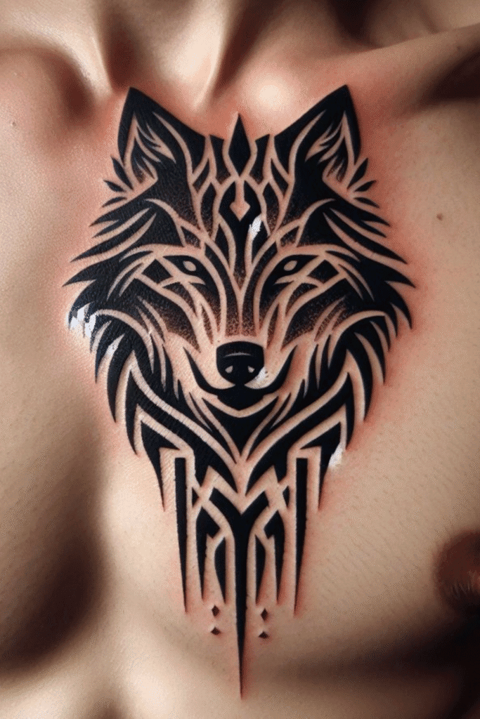 A geometric wolf chest tattoo blends wild instinct with sharp, modern style. The wolf represents loyalty, courage, and resilience, but the geometric twist gives it a clean, structured edge that looks amazing across the chest. Bold lines, symmetry, and smooth shading combine to create a piece that feels both artistic and powerful. You can place the wolf’s face in the center, with geometric patterns radiating outward, or split the design so half sits on each pec—creating an eye-catching mirrored effect. Some guys go for a polygon-style wolf head, others mix realism with geometric fragments for that broken-glass vibe. Either way, it’s intense, masculine, and visually striking. This tattoo hits perfectly if you’re a lone-wolf type with a modern sense of style.
