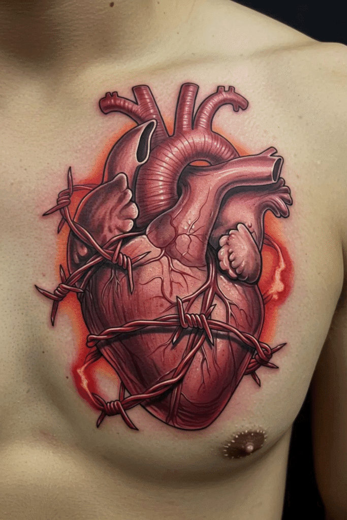 This design blends raw realism with a softer, more emotional edge. An anatomical heart tattoo on the chest sits directly over your real one—creating a powerful symbolic connection. The heart can be shaded with veins, arteries, and organic textures, while flowers like roses, lilies, or peonies wrap around it. The combination represents emotional strength, vulnerability, love, and personal growth. You can go full color for a vivid, artistic look or black and grey for a timeless, classic style. Some men incorporate clockwork gears, vines, or smoke to add storytelling. It’s a deep, meaningful piece that hits just as hard visually as it does symbolically.