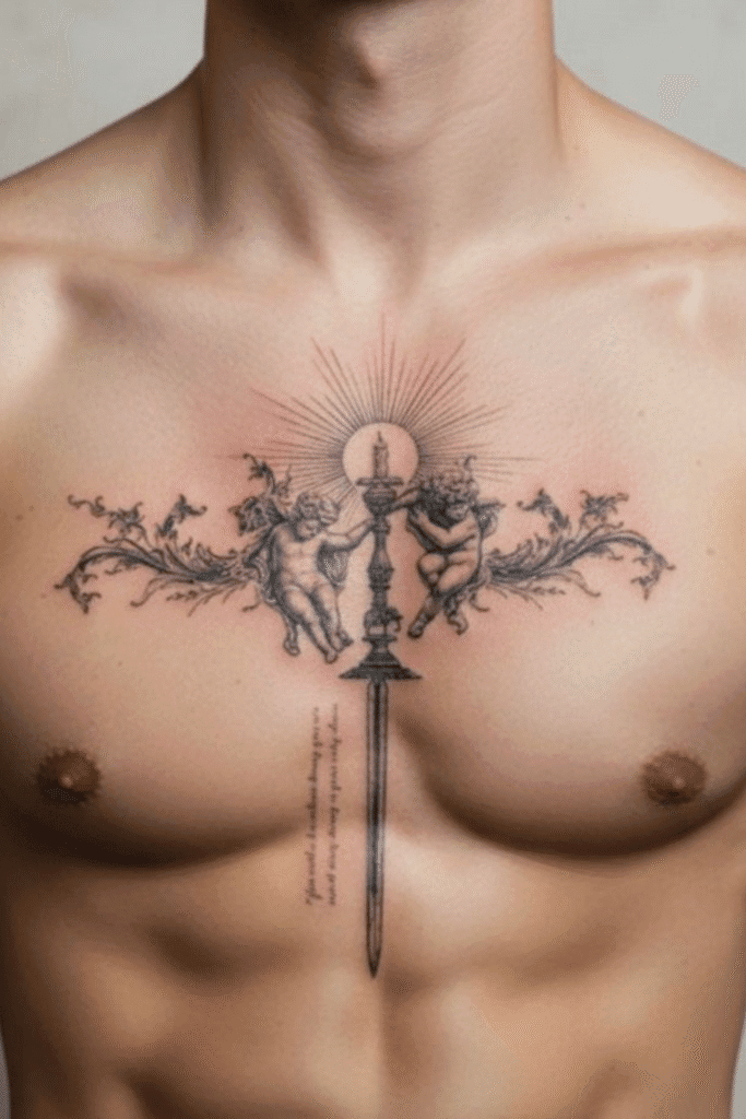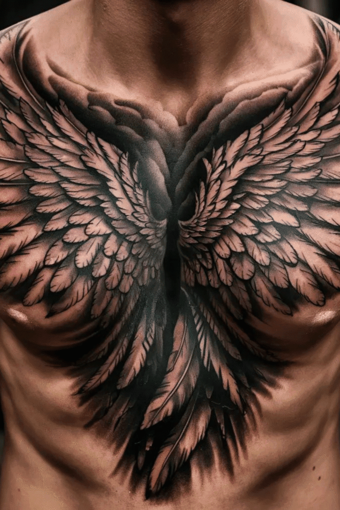 Full-spread angel wings across the chest create a stunning, dramatic effect that transforms your entire upper body. The wings start at the center and fan outward over each pec, sometimes extending toward the shoulders. The feather detailing can be soft and spiritual or bold and intense depending on your vibe. This tattoo symbolizes guidance, protection, ascension, and inner strength. Some men pair wings with a central symbol like a cross, a sword, or a halo for extra meaning. Whether you see yourself as a guardian, a survivor, or someone rising above challenges, angel wings make a powerful statement.
