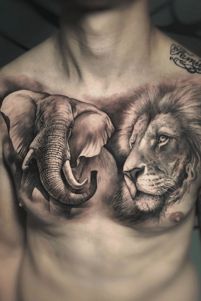 A war elephant tattoo radiates strength, intelligence, and unstoppable determination. Elephants symbolize loyalty, memory, and power—with war armor adding a fierce warrior twist. Placed on the chest, the head sits in the center while the ears spread wide across the pecs, creating a balanced, commanding form. Artists often add tusk details, tribal markings, or battle armor to elevate the design. Whether you prefer a realistic elephant or a stylized version inspired by Indian, Thai, or African motifs, this tattoo hits hard with symbolism. It shows you carry wisdom—and power—with every step.