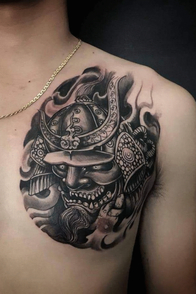 A samurai mask on the chest channels discipline, honor, and warrior spirit. It’s the perfect tattoo for men who value strength and self-control. The design usually sits in the center of the chest, making the mask feel like armor. Intricate linework, fierce facial expressions, and bold Japanese detailing give it a dramatic presence. Some choose a Hannya-style mask for emotional depth, while others stick to a traditional samurai menpō for a more authentic look. Add smoke, cherry blossoms, or rising sun elements to tie everything together. This tattoo is all about inner power—carrying a reminder of your own warrior mindset right over your heart.