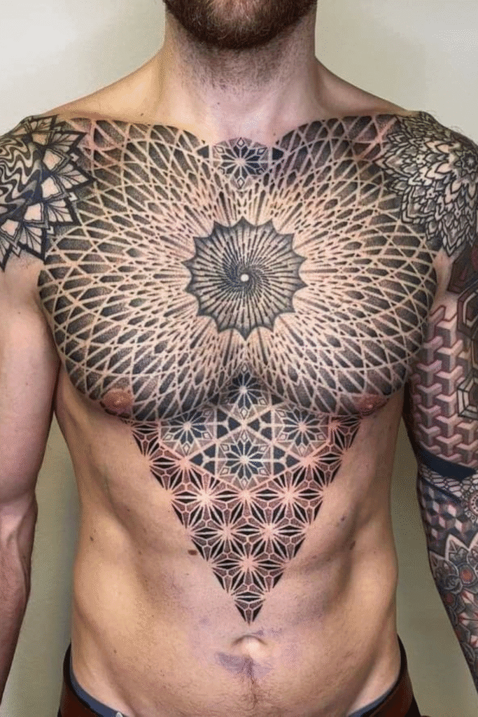 A mandala chest tattoo is perfect for men who want something bold yet spiritual. Mandalas symbolize balance, harmony, and inner peace—making them more than just visually stunning designs. Positioned at the center of the chest, a mandala expands outward with layered circles, petals, and symmetrical shapes that create a hypnotic, almost meditative look. The crisp linework and intricate detail make your chest pop, especially when the design blends into the natural curves of your pecs. You can go minimalist with thin, clean lines, or ultra-detailed with shading and dotwork for a deeper, more textured vibe. Some men connect the mandala to other elements like suns, moons, or geometric extensions stretching toward the shoulders. It’s a tattoo that quietly commands attention while carrying a message of grounded strength and inner clarity.