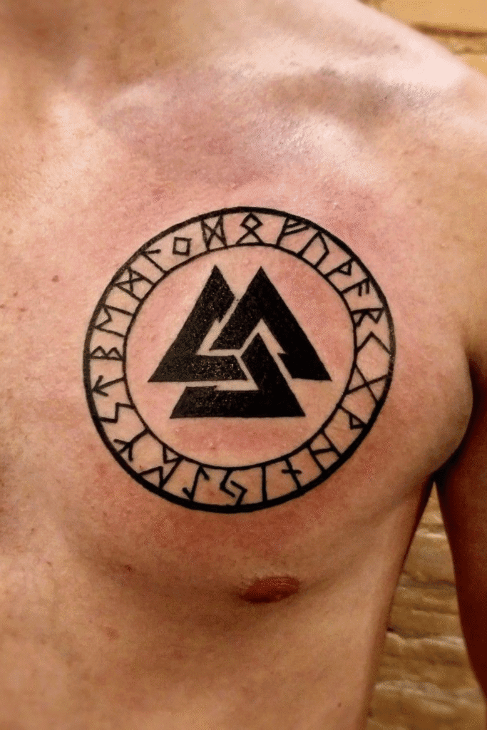 For men drawn to mythology and ancient symbolism, the Valknut chest tattoo is a powerful choice. This iconic triple-triangle symbol is associated with Odin—the god of wisdom, war, and destiny. Placing it at the center of your chest gives it a commanding, almost mystical vibe. The clean lines of the Valknut pair perfectly with runes circling around it or stretching toward your shoulders. Some guys add ravens, axes, or Nordic knotwork to complete the look. Whether you’re honoring heritage or resonating with the deeper symbolism of strength, bravery, and fate, this design carries weight and presence. It’s a tattoo that feels ancient, mysterious, and deeply masculine.