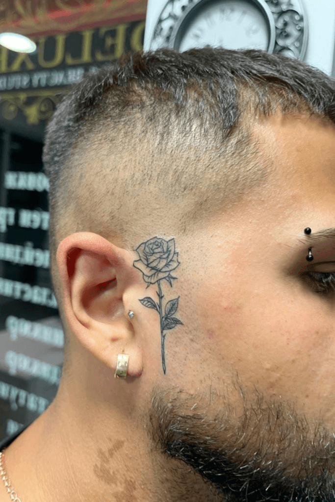 A rose on the face balances strength with vulnerability. It represents passion, deep emotion, growth, and the beauty that can bloom from pain. Many men choose it to symbolize love, transformation, or a powerful life chapter that shaped who they are today. Roses can be shaded dark for intensity or done in fine-line form to create an elegant contrast against tough features. Positioned along the cheek, near the eye, or on the temple, it instantly adds artistic depth. This tattoo tells the world there’s softness behind the toughness, heart behind the armor, and meaning behind every scar. It’s a reminder that real strength isn’t cold—it feels deeply, loves fiercely, and still stands strong no matter what storms come.