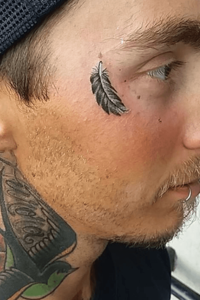 A feather tattoo represents freedom, peace, lightness, and spiritual growth. It symbolizes letting go, rising above stress, and staying graceful under pressure. Placed near the eye or cheek, it adds softness while still looking powerful. Feathers are often chosen by men who believe in calm strength rather than aggressive dominance. It reflects wisdom, emotional stability, and higher thinking. This tattoo feels poetic, soulful, and effortlessly stylish.